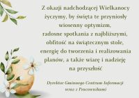 Z okazji nadchodzącej Wielkanocy życzymy, by święta te przyniosły wiosenny optymizm, radosne spotkania z najbliższymi, obfitość na świątecznym stole, energię do tworzenia i realizowania planów, a także wiarę i nadzieję na przyszłość