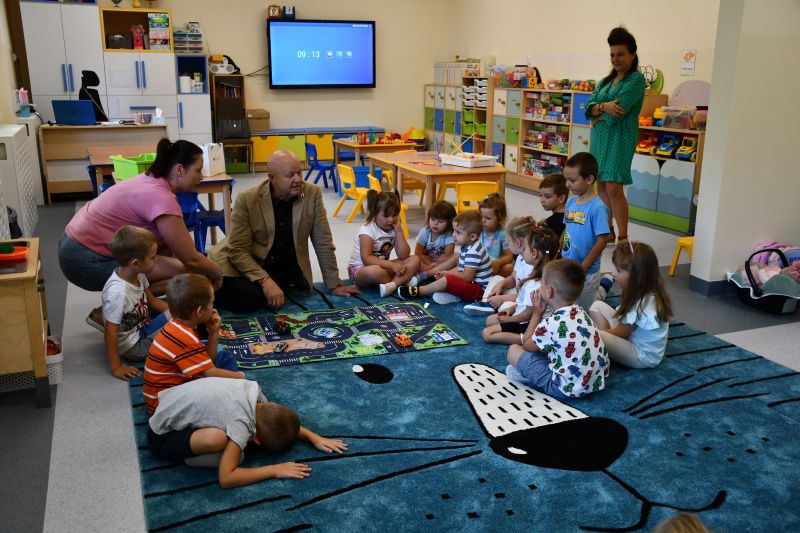 Nowoczesna przestrzeń została oficjalnie zaprezentowana w obecności burmistrza Łukasza Koperskiego i dyrektor szkoły Urszuli Gowin. Burmistrz nie tylko obejrzał efekty prac, ale również osobiście spotkał się z dziećmi. Razem z nimi testował interaktywny dywan służący poznaniu zasad ruchu drogowego, który stał się atrakcją nowej sali.