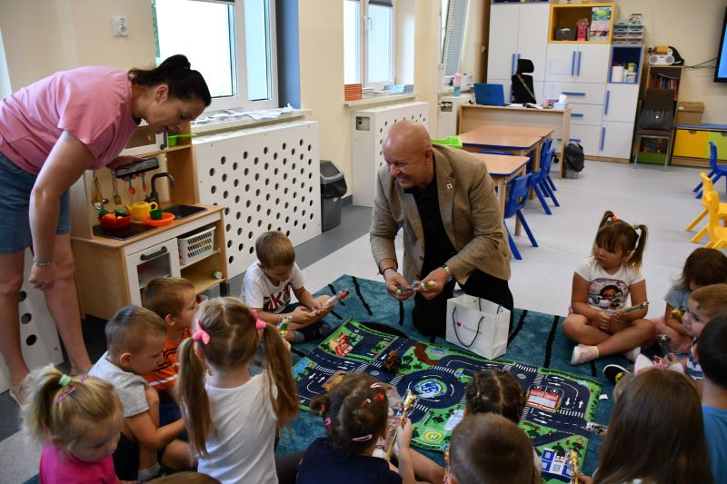 Na przedszkolaków czekała także niespodzianka. Każdy z nich otrzymał od burmistrza gminny gadżet - kolorowy, drewniany ołówek ozdobiony drewnianą figurką. Dzieci z radością przyjęły upominki, a wspólna zabawa i rozmowy wprowadziły do uroczystego spotkania dużo ciepła i uśmiechu.
